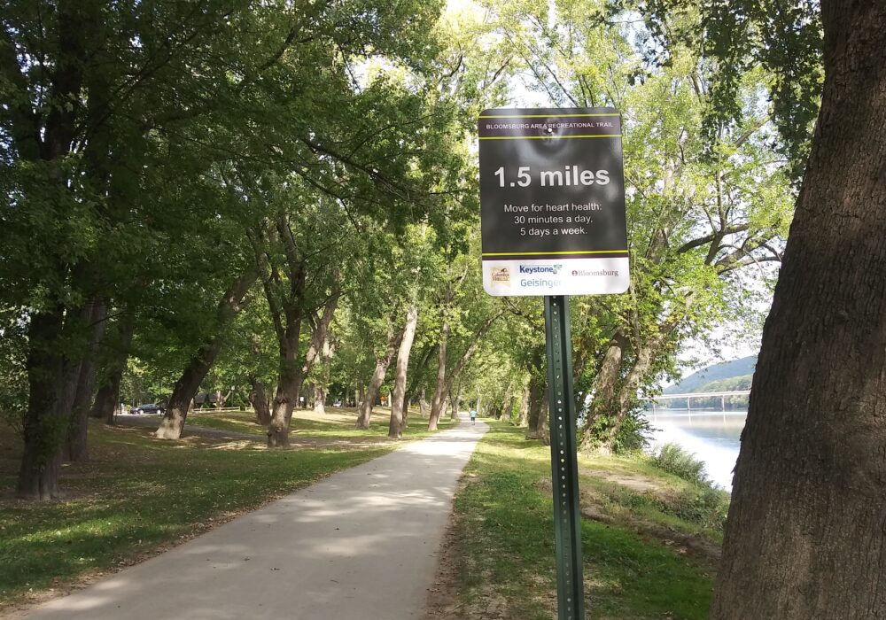 The Bloomsburg Area Recreational Trail (BART) is a 2.2-mile walking and biking path in Bloomsburg, Pennsylvania. It is a paved, flat path suitable for all experience levels. There are two trail heads on either side of Fort McClure Boulevard and the trail runs east to west, paralleling the road. Leashed dog walking is permissible in the dog park and on the path, but not in the nearby town park. The North Branch of the Susquehanna River is visible from the trail. (Accessing the river is only permissible from the designated PFBC or Municipal Accesses.) Wooden fencing that separates the trail from the riverbank is not present in all sections, so it is best to use caution when walking/biking in the grassy areas nearby. Permanent signage along the trail denotes progress every 1/2 mile.