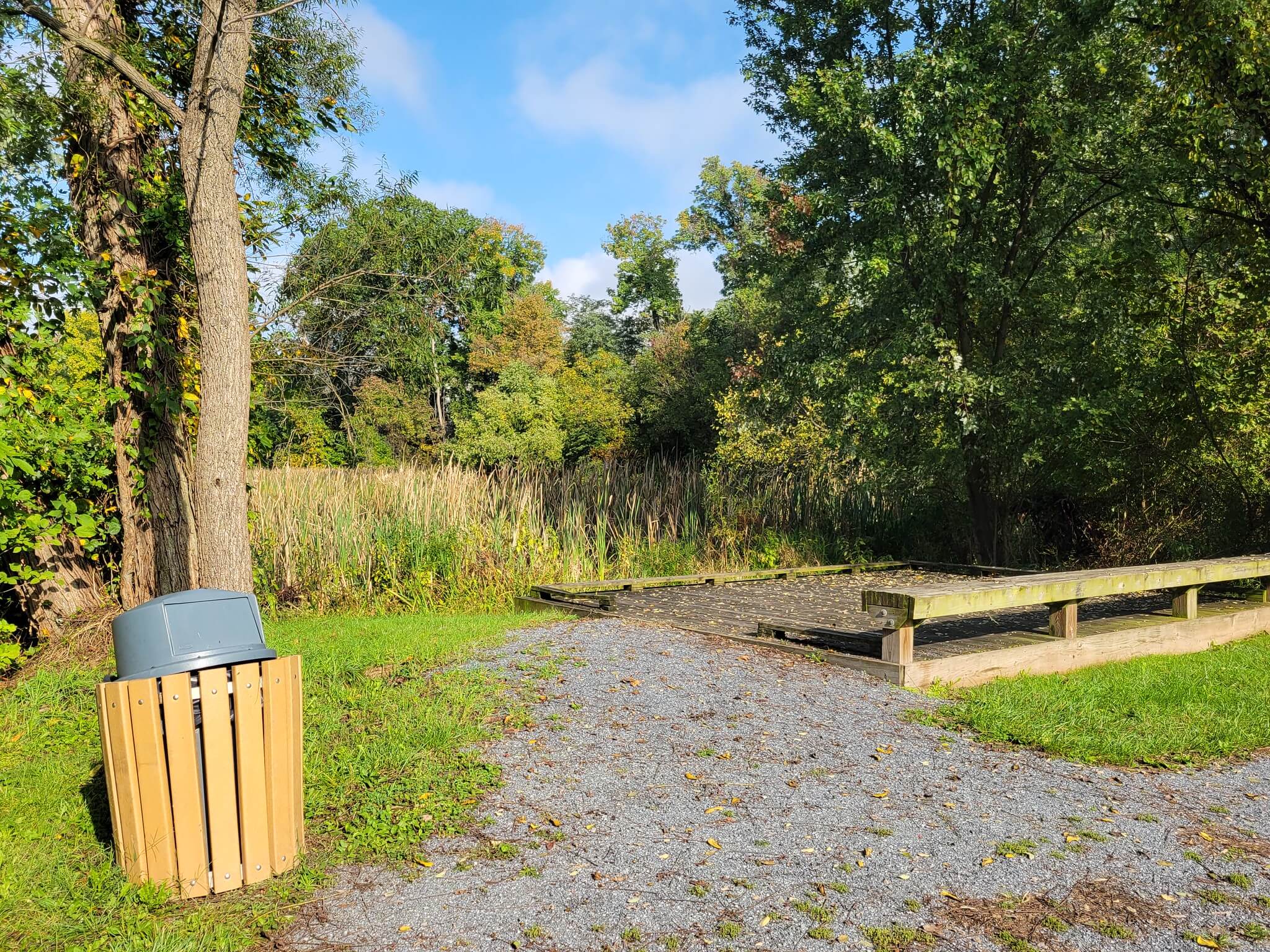 Accessibility features include one unlined accessible space in the gravel lot off White House Lane (east end), which is not van-accessible, and two van-accessible spaces with striped aisles in the paved lot off Catherine Street (west end). The trail surface is a mix of gravel and wooden boardwalk, both equipped with edge barriers or railings. It is typically at least five feet wide and mostly flat, with a grade of 1% or less, making it navigable for most wheelchairs, mobility devices, and strollers.