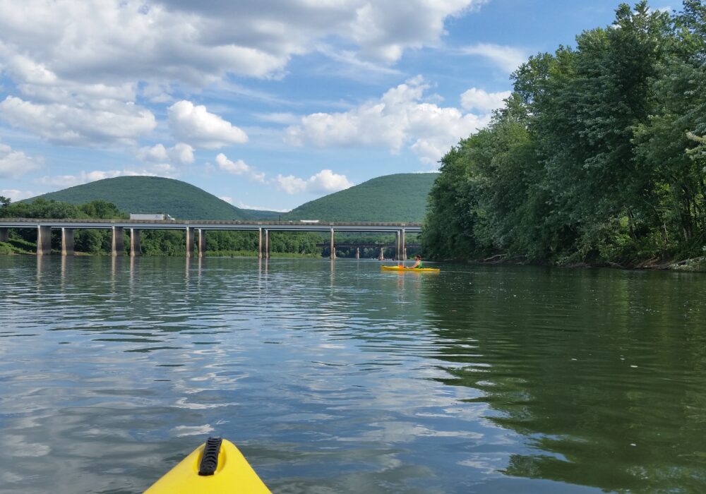 Launch your kayak out of Memorial Park Access next to the Great Island West (SR-1002) Bridge. Take caution, as the surface of the access is primarily dirt and can get muddy. The access is immediately adjacent to Great Island, the former site of three Munsee indigenous communities. You can paddle river right around the island to pass the confluence of the Susquehanna River and Bald Eagle Creek when the water level is higher. At lower levels, paddle river left and under Great Island East (SR-1002) Bridge to avoid getting stuck on the eel weir, a V-shaped stone structure historically used by indigenous peoples to catch eel as they traveled downstream.